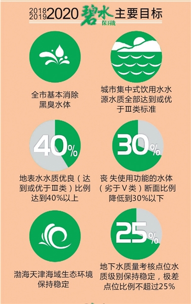 到2020年,全市基本消除黑臭水體;城市集中式飲用水水源水質(zhì)全部達(dá)到或優(yōu)于Ⅲ類標(biāo)準(zhǔn);渤海天津海域生態(tài)環(huán)境保持穩(wěn)定;地表水水質(zhì)優(yōu)良(達(dá)到或優(yōu)于Ⅲ類)比例達(dá)到40%,喪失使用功能的水體(劣于Ⅴ類)斷面比例降低到30%。