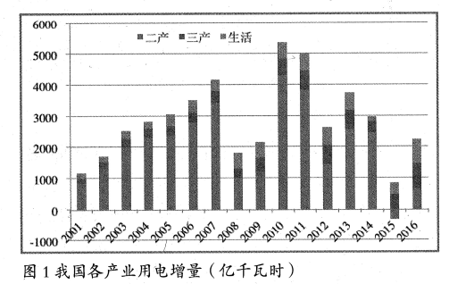 2008年金融危機之后,我國二產(chǎn)用電量增長放緩,波動很大,但三產(chǎn)和生活用電保持穩(wěn)定增長。其中,2015午二產(chǎn)用電負增長;2016年用電增量2265億千瓦時,二產(chǎn)、三產(chǎn)、居民生活用電增量分別為666億千瓦時、795億千瓦時、769億千瓦時,三分天下。