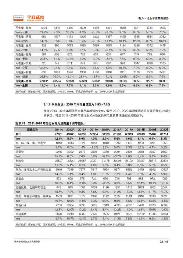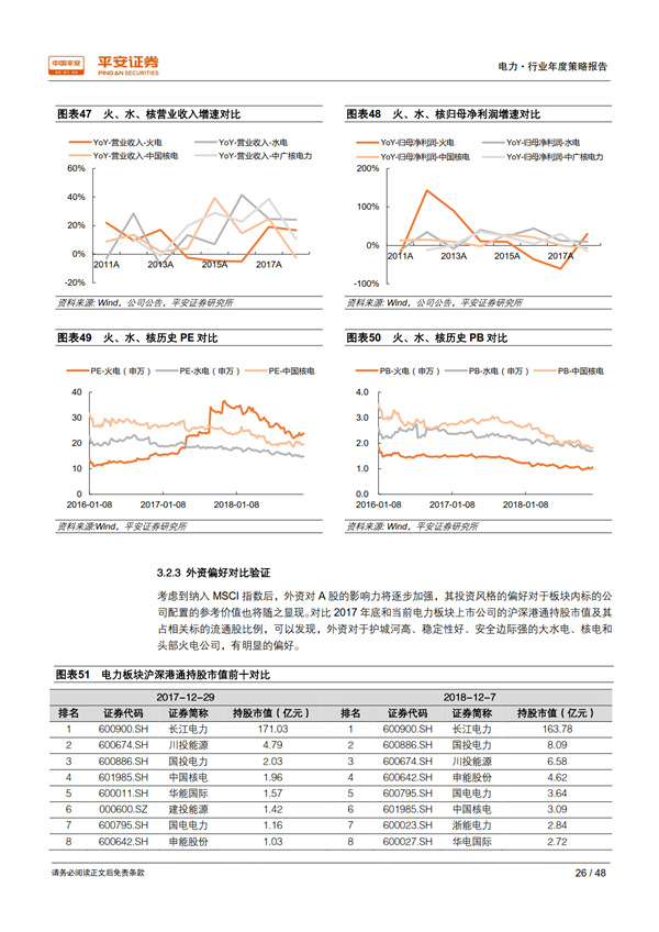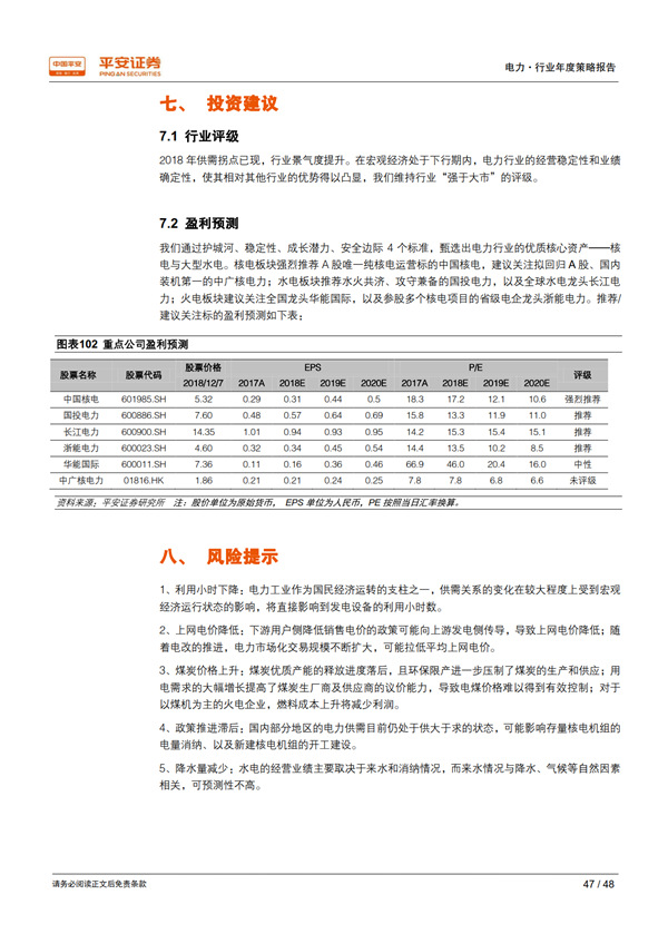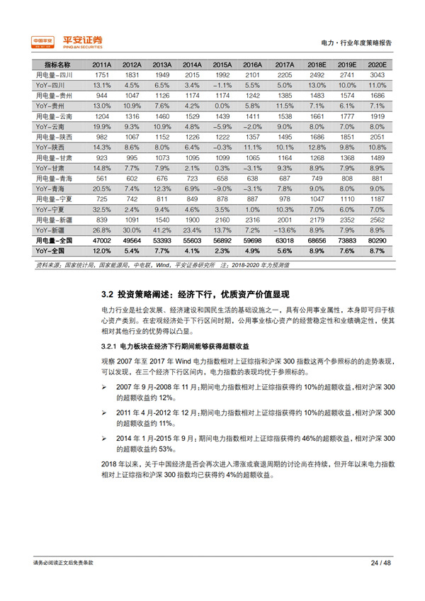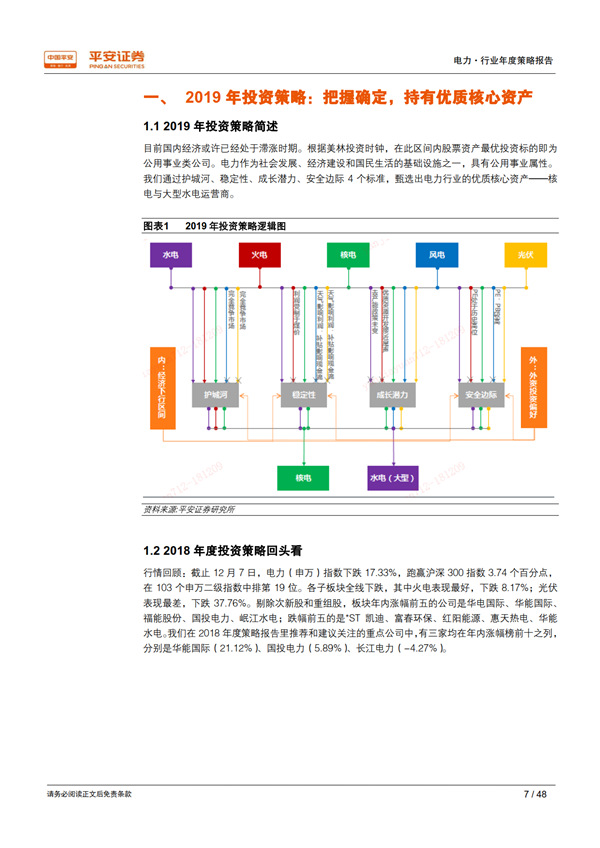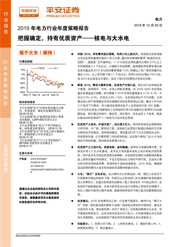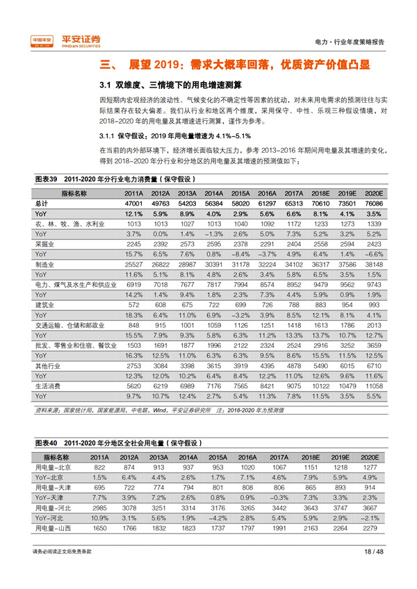 展望 2019:需求大概率回落,優(yōu)質資產價值凸顯: 我們從行業(yè)和地區(qū)兩個維度,采用保守、中性、樂觀三種假設情境,對 2018-2020 年的用電量及其增速進行測算,保守情境下 2019 年用電量增速為 4.1%-5.1%、中性為 6.0%-6.3%、樂觀為 6.9%-7.6%。 當宏觀經濟處于下行時期,公用事業(yè)核心資產經營穩(wěn)定性和業(yè)績確定性的優(yōu)勢將得以凸顯。 最近十年中的三個經濟下行期內,電力板塊的表現(xiàn)均優(yōu)于上證綜指和滬深 300 指數(shù);2018開年以來電力指數(shù)相對上證綜指和滬深 300指數(shù)均已獲得約 4%的超額收益。 我們通過護城河、 穩(wěn)定性、成長潛力、安全邊際 4 個標準,甄選出板塊內的優(yōu)質資產——核電與大型水電運營商。