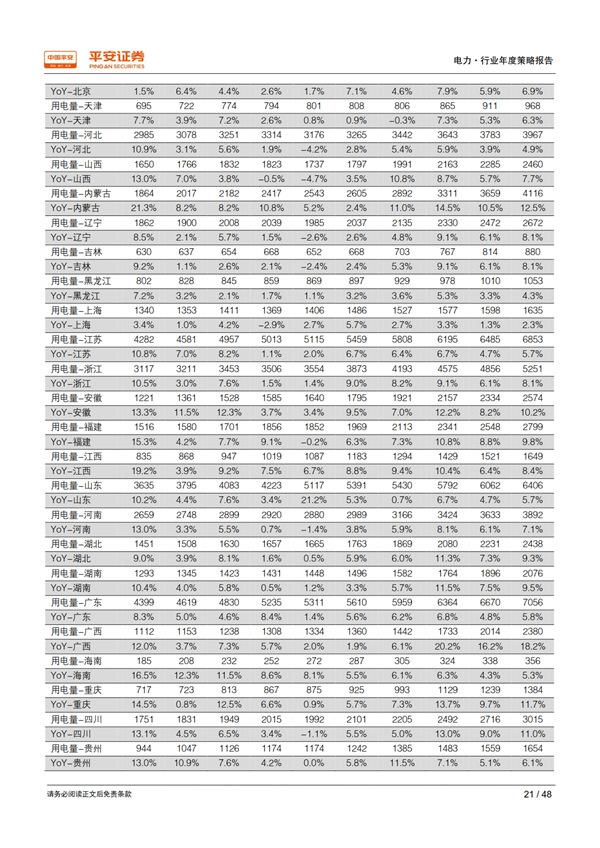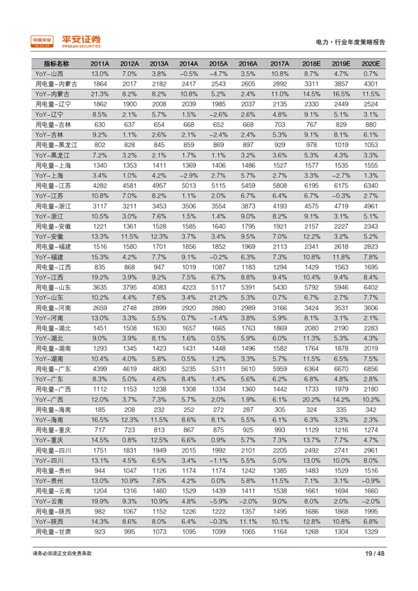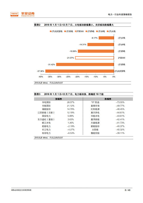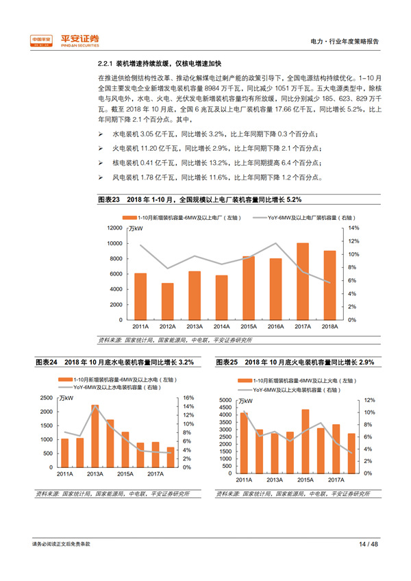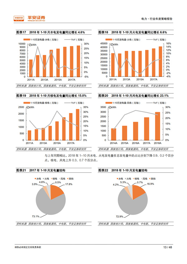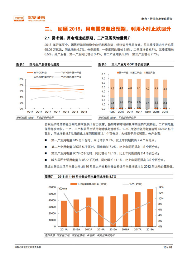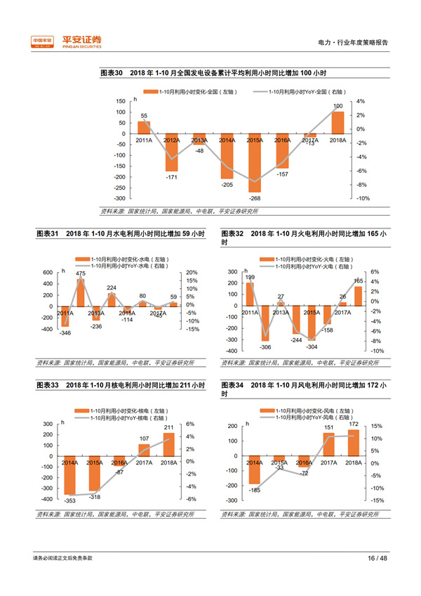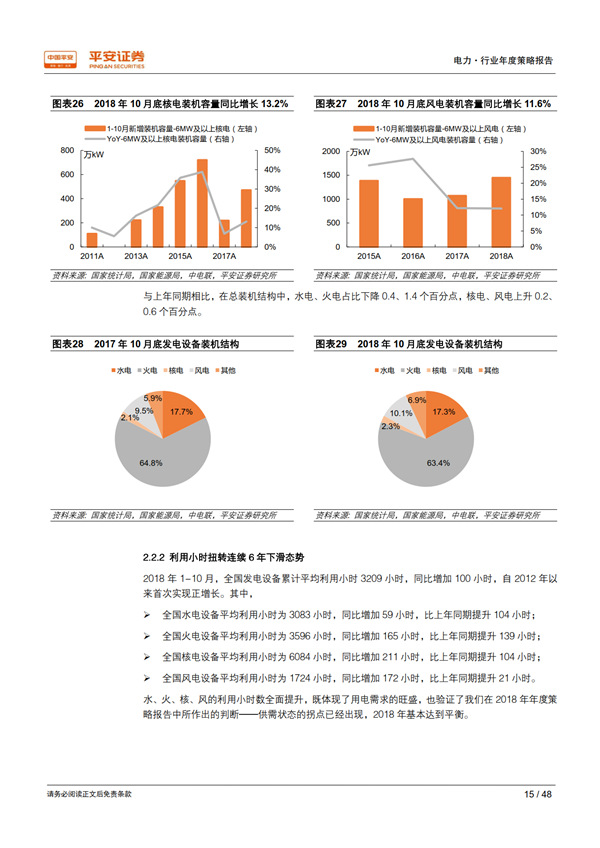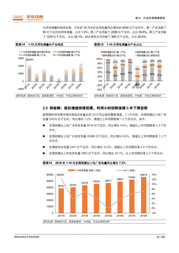 回顧 2018:用電需求超出預期,利用小時止跌回升。 宏觀經濟總體持穩(wěn)為全社會用電量增長提供了有力支撐,疊加年初寒潮和夏季“高溫時間長、范圍廣、強度強”的氣候特征, 1-10 月全社會用電量同比增長 8.7%,比上年同期提高 2.1 個百分點,大幅高于年初預期。超預期的用電需求增長推動發(fā)電量達到 2012 年以來的最高增速 7.2%;規(guī)模以上電廠裝機容量同比增長 5.2%,比上年同期下降 2.1 個百分點;利用小時同比增加 100 小時,自 2012 年以來首次正增長, 驗證了我們對供需拐點到來的判斷。