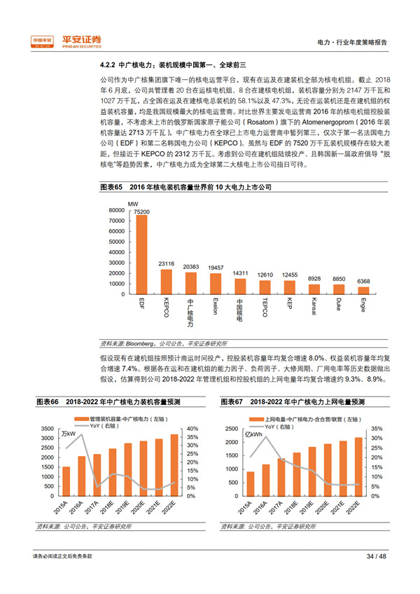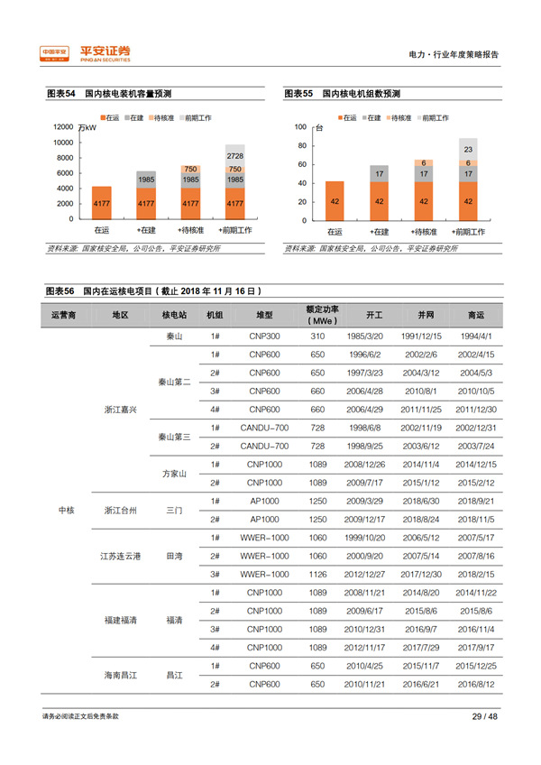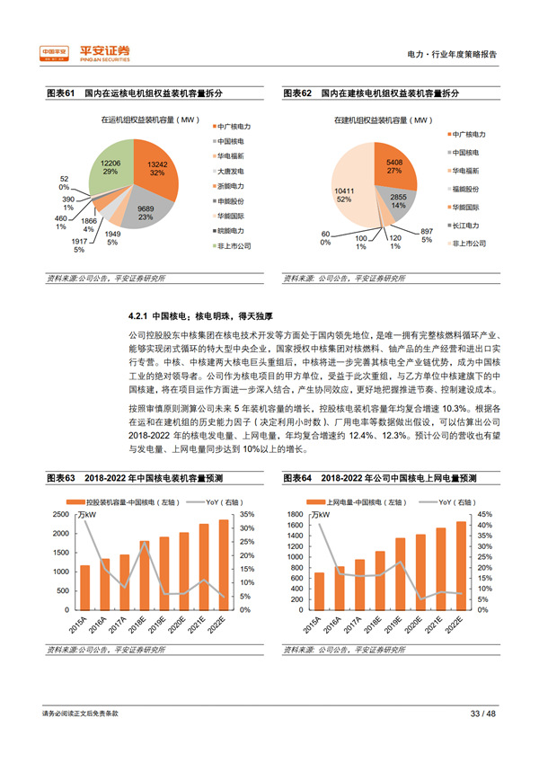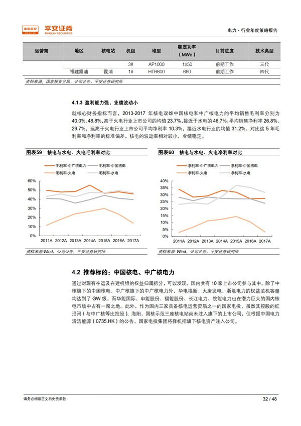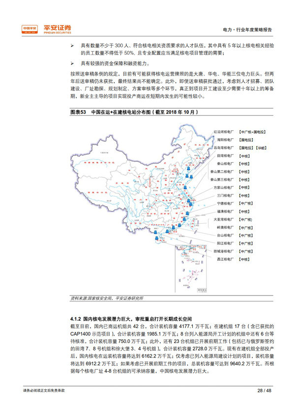 優(yōu)質資產之核電:護城河寬廣,成長潛力巨大。 國內具有核電運營牌照的只有中核、中廣核、國電投三家,其他電力運營商只能通過參股的方式參與核電站開發(fā)建設,競爭格局穩(wěn)定。 審批重啟打開了行業(yè)長期成長空間,考慮現(xiàn)有在建、已開展前期工作的規(guī)劃機組,以及每個核電廠址 4-8 臺機組的可承納容量,國內核電發(fā)展?jié)摿薮蟆?/p>