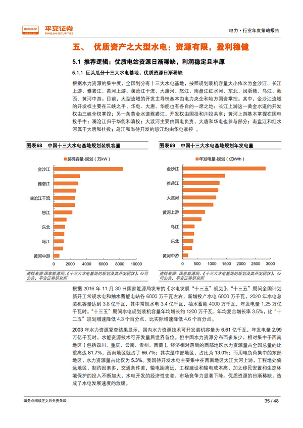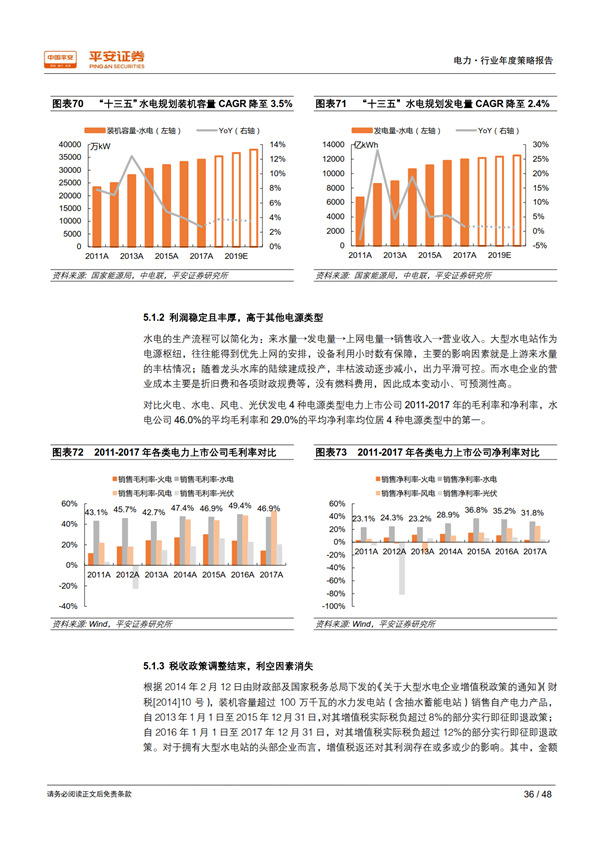 優(yōu)質資產之大型水電:資源有限,盈利穩(wěn)健。 按照水力資源的集中度,全國劃分有十三大水電基地,其開發(fā)主導權基本由電力央企和地方國資掌控,待開發(fā)水電中的優(yōu)質資源日漸稀缺。水電經營業(yè)績的主要影響因素就是上游來水量的豐枯情況, 干流大型電站出力相對平滑可控,且成本主要為折舊和各項財政規(guī)費,利潤率優(yōu)于其他電源類型。 2019 年起,增值稅返還政策到期對大型水電利潤的負面影響將基本消失。