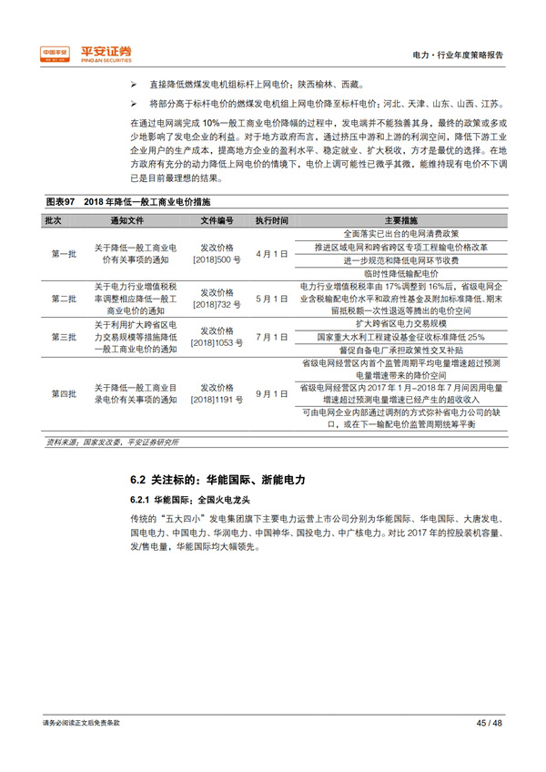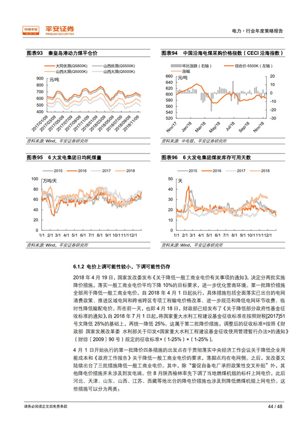 火電:“春天”還有多遠。 動力煤作為大宗商品的一種,理論上在經濟下行周期其價格也將趨同下降。但我們認為有關部門對支撐煤價具有較強的決心和掌控力。在通過電網(wǎng)端完成降低一般工商業(yè)電價 10%的過程中,發(fā)電端并不能獨善其身,在地方政府有充分動力去降低上網(wǎng)電價的情境下,電價上調的可能性已微乎其微,能維持現(xiàn)有電價不降已是目前最理想的結果。