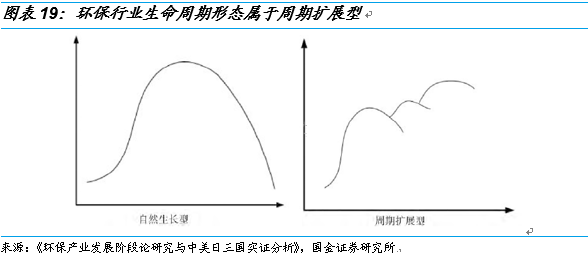 常杪在《環(huán)保產(chǎn)業(yè)發(fā)展階段論研究與中美日三國實證分析》提出,環(huán)保產(chǎn)業(yè)的生命周期形態(tài)屬于周期擴展型,即隨著環(huán)保產(chǎn)業(yè)的發(fā)展和環(huán)境質(zhì)量的改善,環(huán)保產(chǎn)業(yè)發(fā)展重心將根據(jù)需求的變化而發(fā)生改變,進而帶來新的周期性發(fā)展。