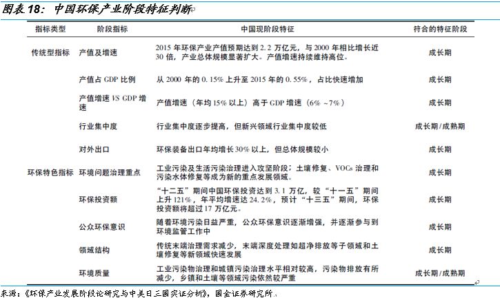 我國環(huán)保產(chǎn)業(yè)發(fā)展的大部分特點符合成長期的特征,個別領(lǐng)域已呈現(xiàn)成熟期特征,因此我國環(huán)保產(chǎn)業(yè)發(fā)展正處于成長期向成熟期的邁進的重要階段,但遠未進入拐點期,在可預(yù)見的中長期內(nèi)仍有較大的發(fā)展空間和潛力。