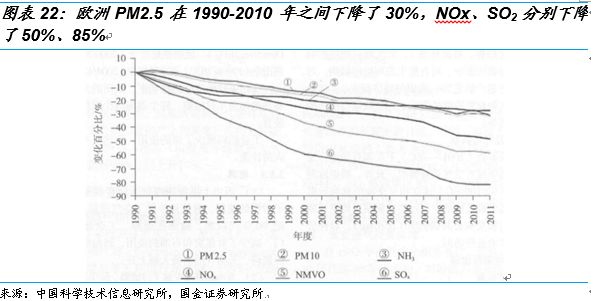 我們對比歐洲幾十年的治理之路,1952年倫敦?zé)熿F事件后開始大氣治理。1975年倫敦的霧霾天氣由每年幾十天減少到了15天,1980 年降到5天。整個歐洲的PM2.5的排放量從1990年到2010年的20年間下降了30%?!洞蜈A藍天保衛(wèi)戰(zhàn)三年行動計劃》要求5年間PM2.5未達標地級及以上城市濃度比2015年下降18%以上,即使我國有集中力量辦大事的優(yōu)勢,但空氣改善任務(wù)依然艱巨,時間緊任務(wù)重。