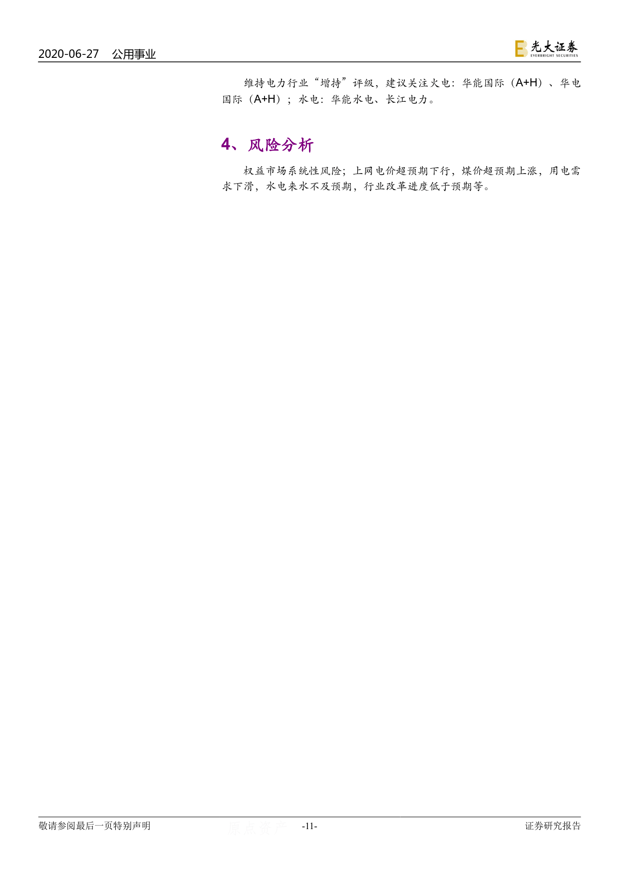 2020年政府工作報(bào)告明確要求“降低工商業(yè)電價(jià) 5%政策延長(zhǎng)到今年年底”,對(duì)于發(fā)電側(cè)而言,我們認(rèn)為通過(guò)行政性指令降低計(jì)劃電價(jià)的概率較低;在電力市場(chǎng)化改革進(jìn)程加速背景下,市場(chǎng)化規(guī)模的擴(kuò)張可能拉低發(fā)電側(cè)綜合上網(wǎng)電價(jià)水平,但對(duì)于市場(chǎng)化比例基數(shù)較高的火電龍頭公司整體影響有限,市場(chǎng)對(duì)于發(fā)電企業(yè)上網(wǎng)電價(jià)的悲觀預(yù)期有望修復(fù)。“新冠”疫情對(duì)于用電需求構(gòu)成短期沖擊,但在社會(huì)生產(chǎn)恢復(fù)、電力需求復(fù)蘇預(yù)期下火電利用小時(shí)數(shù)提升空間可觀,煤價(jià)仍處于綠色區(qū)間內(nèi),當(dāng)前競(jìng)爭(zhēng)要素有利于火電基本面持續(xù)回暖,而估值的修復(fù)將取決于市場(chǎng)電改革“質(zhì)變”背景下火電“定價(jià)權(quán)”的實(shí)質(zhì)性提升。
