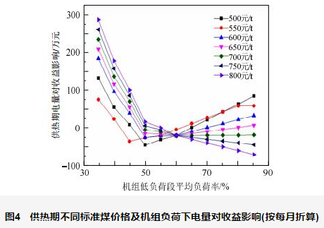 供熱機組供熱期平均出力下限按60%額定負荷計算,可得出不同負荷下發(fā)電量對收益的影響,如圖3、圖4所示。