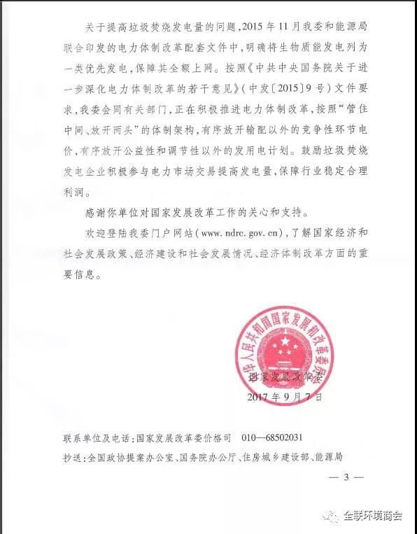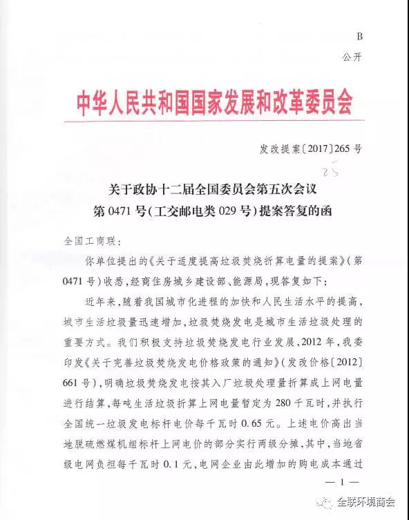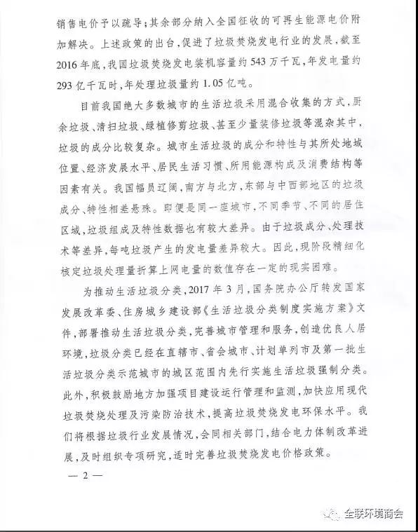 今年年初,環(huán)境商會以全國工商聯(lián)團體提案的形式向兩會遞交《關(guān)于適度提高垃圾焚燒折算電量的提案》,國家發(fā)改委于9月正式答復(fù)。