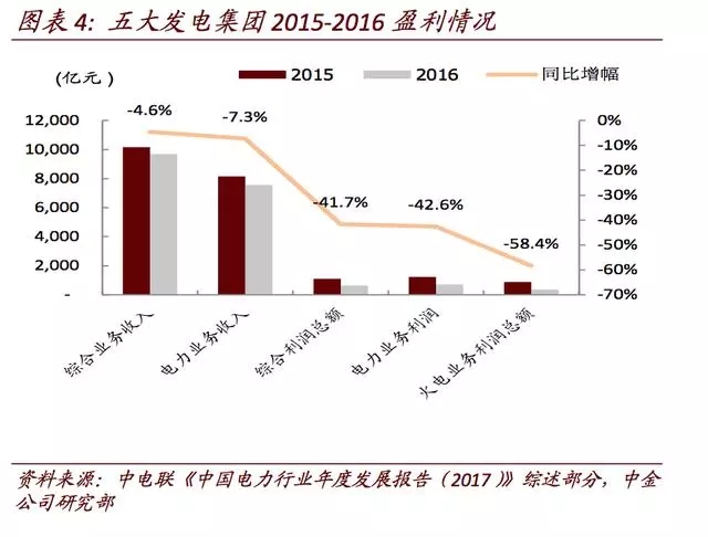 利用小時自2011年呈下跌趨勢。根據(jù)中電聯(lián)發(fā)布的《中國電力行業(yè)年度發(fā)展報告(2017)》綜述部分提供的數(shù)字來看,五大發(fā)電集團(華能、華電、國電、大唐、國電投)在2016年電力業(yè)務(wù)收入同比下降7.3%,電力業(yè)務(wù)利潤同比下降42.6%,其中火電業(yè)務(wù)利潤大幅下滑58.4%。