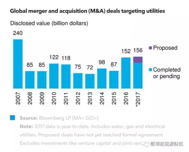 2017年,已披露的電廠收購項目總規(guī)模為1559億美元,達到了2007年以來最高水平。該數(shù)字包括大約300億美元的“擬議”交易,即目前仍處于初步階段或媒體報道可能成型的交易。然而,即使剔除這部分“擬議”交易,2017年的交易總規(guī)模也已接近2016年的全年水平。