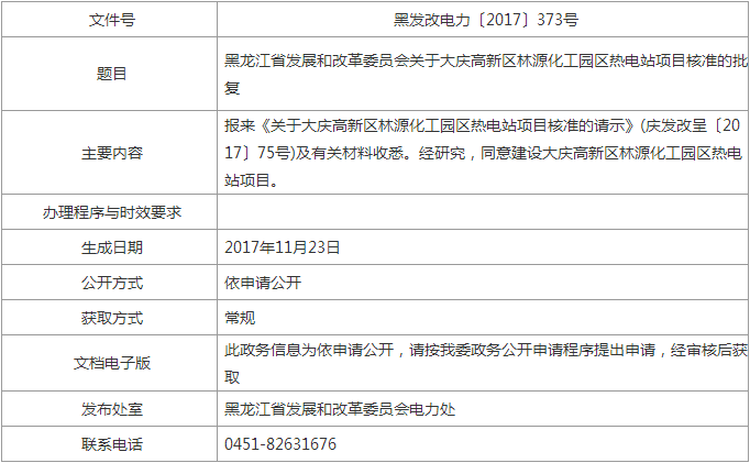 黑龍江省發(fā)展和改革委員會(huì)關(guān)于大慶高新區(qū)林源化工園區(qū)熱電站項(xiàng)目核準(zhǔn)的批復(fù)