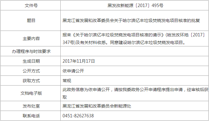 黑龍江省發(fā)展和改革委員會(huì)關(guān)于哈爾濱億豐垃圾焚燒發(fā)電項(xiàng)目核準(zhǔn)的批復(fù)