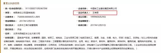 熱心讀者向中國(guó)核能發(fā)來通過“國(guó)家企業(yè)信用信息公示系統(tǒng)”查詢到的該集團(tuán)有關(guān)信息,其中顯示,公司制改制后,中國(guó)核工業(yè)建設(shè)集團(tuán)有限公司法人、董事長(zhǎng)為王壽君。另外,公示系統(tǒng)也顯示了其他主要管理人員信息。