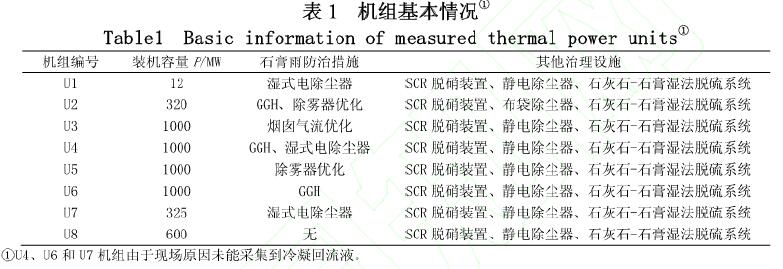 上海市燃煤電廠主要以裝機(jī)容量30萬kW以上的大機(jī)組為主,部分機(jī)組針對石膏雨防治已采取一些措施,如煙氣換熱器(GGH)和濕式電除塵器,測量項目為煙塵、CPM、石膏雨沉降斑點數(shù)、石膏雨沉降量、液滴濃度、排煙溫度、冷凝回流液pH、冷凝回流液硫酸根濃度,機(jī)組情況見表1。其中U2、U4和U6機(jī)組均裝有GGH,U2機(jī)組采用傳統(tǒng)的回轉(zhuǎn)式GGH,以熱煙氣為熱源進(jìn)行換熱,U4機(jī)組的GGH以水為介質(zhì)對冷、熱煙氣進(jìn)行換熱,U6機(jī)組采用回?zé)崾紾GH,以蒸汽為熱源對凈煙氣加熱。U3和U5機(jī)組僅針對治理設(shè)施進(jìn)行了一些優(yōu)化,U8機(jī)組未采用任何石膏雨防治措施,選為對照機(jī)組。監(jiān)測項目有煙塵、CPM、石膏雨沉降斑點數(shù)、石膏雨沉降量、液滴濃度、排煙溫度、冷凝回流液pH值、冷凝回流液中SO42-質(zhì)量濃度。