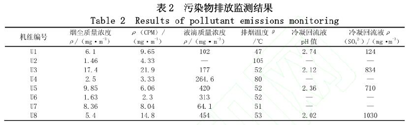 燃煤電廠排放的一次顆粒物實質(zhì)上包括可過濾顆粒物(FPM)與可凝結(jié)顆粒物(CPM),目前國內(nèi)標(biāo)準(zhǔn)方法中的煙塵實際為FPM,美國EPA對CPM的定義為:該物質(zhì)在煙道溫度狀況下在采樣位置處為氣態(tài),離開煙道后在環(huán)境狀況下降溫數(shù)秒內(nèi)凝結(jié)成為液態(tài)或固態(tài),此類物質(zhì)通常以冷凝核的形式存在,空氣動力學(xué)直徑<1μm,屬于微細(xì)顆粒物。研究表明CPM排放與FPM水平相當(dāng)[9-10],燃煤電廠排放的CPM由煙囪排出后,在一定的氣象條件下,容易變成顆粒物隨石膏雨直接降下。因此,除測量與石膏雨排放密切相關(guān)的石膏雨沉降量和液滴濃度外,同時對煙塵和CPM濃度進(jìn)行監(jiān)測,此外還對部分機(jī)組煙氣中冷凝回流液進(jìn)行收集,測量其pH值和硫酸根濃度。