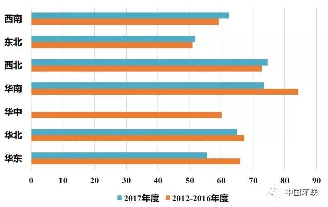 上圖是2012-2017生活垃圾焚燒價(jià)格補(bǔ)貼處理費(fèi)熱力圖,處理費(fèi)越高區(qū)域,顏色越深,整體來(lái)看,華東、華南處于深色區(qū)域。