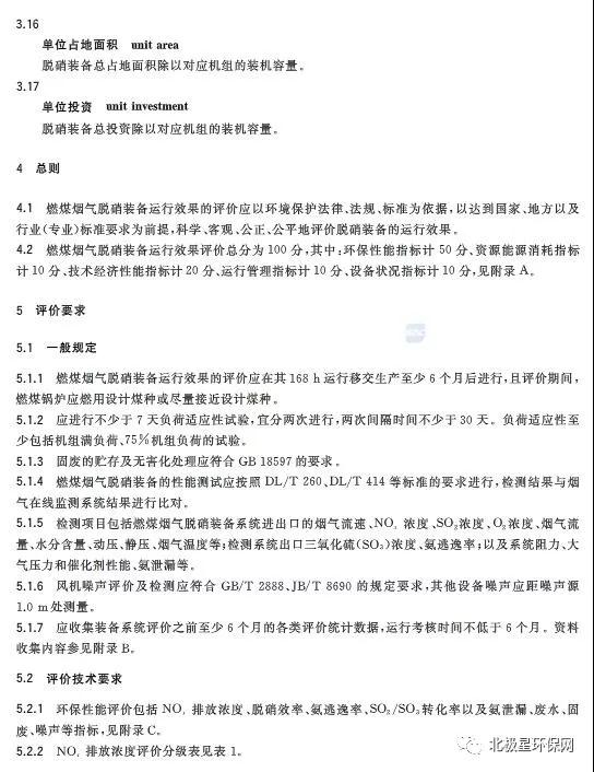 中華人民共和國國家質(zhì)量監(jiān)督檢驗檢疫總局、中國國家標準化管理委員會發(fā)布《燃煤煙氣脫硝裝備運行效果評價技術(shù)要求 GB/T 34340-2017 》。根據(jù)標準要求,燃煤煙氣脫硝裝置運行效果評價總分為100分,其中,環(huán)保性能指標占50分,資源能源消耗指標占10分、技術(shù)經(jīng)濟性能指標占20分,運行管理指標占10分,設(shè)備狀況指標占10分。詳見附錄A。環(huán)保性能評價指標包括NOx排放濃度、脫硝效率、氨逃逸率、SO2/SO3轉(zhuǎn)化率以及氨泄漏、廢水、固廢、噪聲等,詳見附錄C。資源能源消耗指標有催化劑消耗、還原劑消耗、水耗、能耗,詳見附錄D。附錄中對各指標評價方法給出詳細規(guī)定。