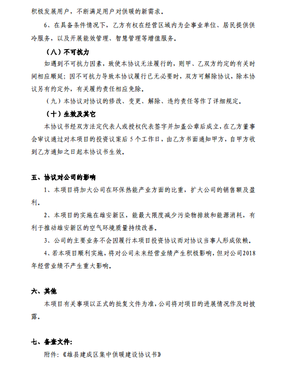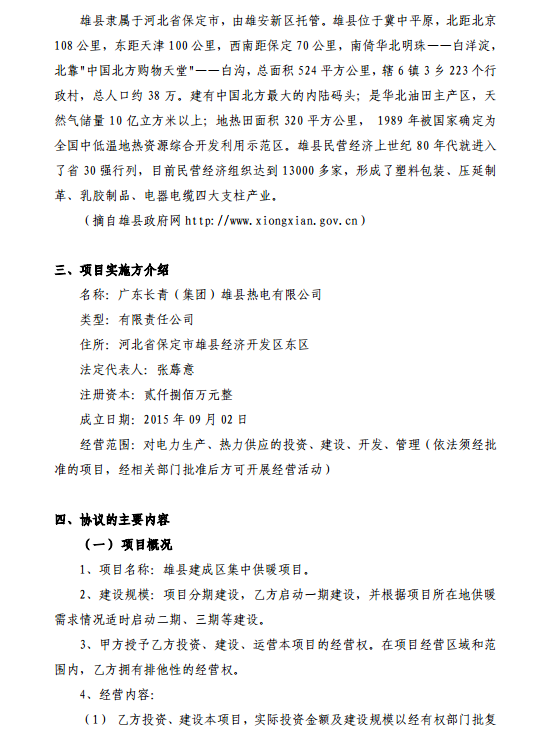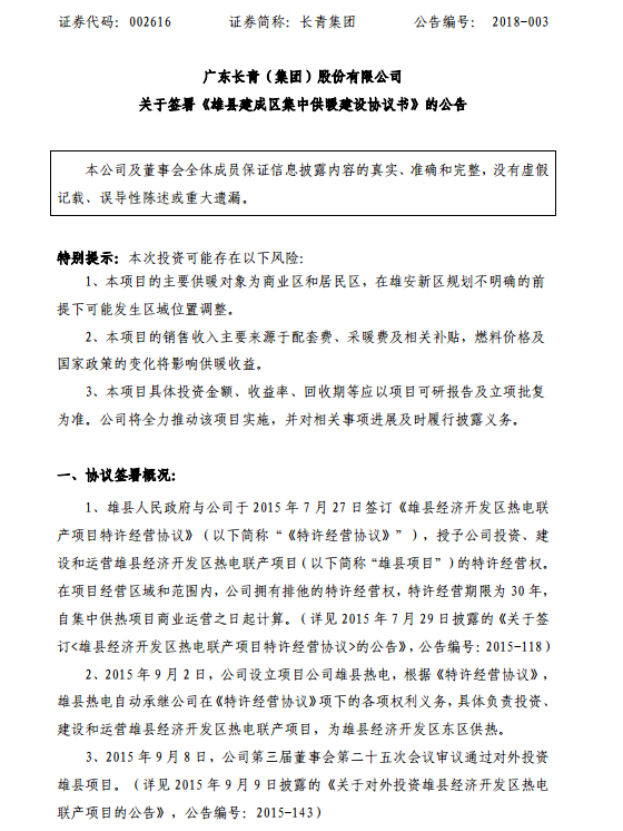 長青集團(tuán)8日晚間公告,公司子公司雄縣熱電與獲雄縣人民政府授權(quán)的雄縣住房和城鄉(xiāng)建設(shè)局于2018年1月8日簽訂《雄縣建成區(qū)集中供暖建設(shè)協(xié)議書