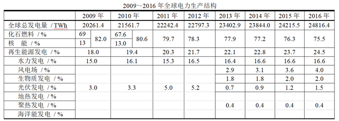 根據(jù)REN21(Renewable Energy Policy Network for the 21st Century)2015~2017年的報告匯集成表。全球總發(fā)電量數(shù)據(jù)來自《BP Statistical Review of World Energy June 2017》。截止2016年全球再生能源發(fā)電占電力總量的24.5%,其中水力發(fā)電最高,占16.6%,其次是風電場占4.0%、生物質發(fā)電占2.0%和光伏發(fā)電占1.5%。