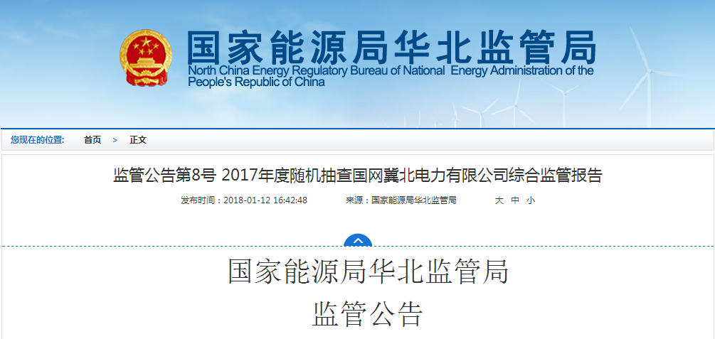 近日,國家能源局華北監(jiān)管局公布了第8號監(jiān)管公告(2018年第1號):2017年度隨機抽查國網(wǎng)冀北電力有限公司綜合監(jiān)管報告,全文如下: