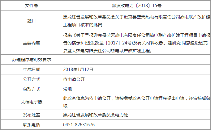 黑龍江省發(fā)展和改革委員會(huì)關(guān)于遜克縣藍(lán)天熱電有限責(zé)任公司