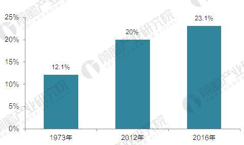 圖表2:1973-2016年全球天然氣發(fā)電在總發(fā)電量中所占份額(單位:%)