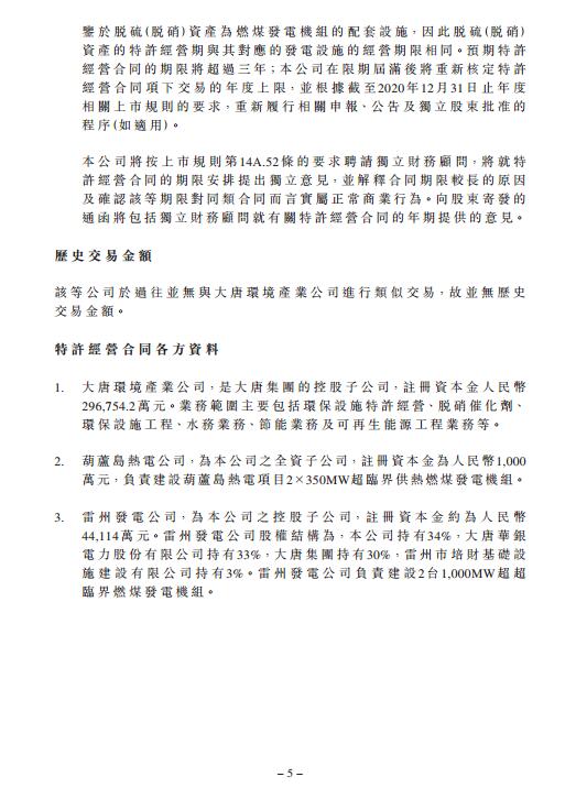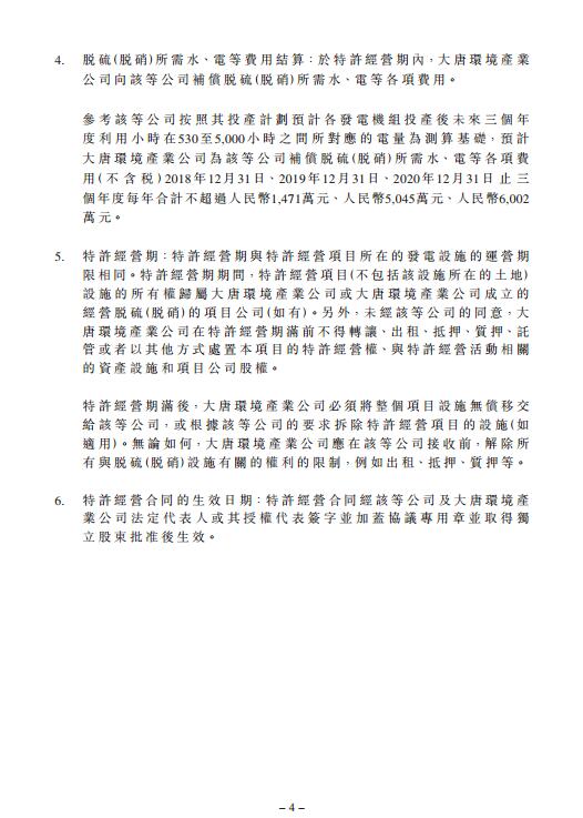 經(jīng)營特許期內(nèi),由大唐環(huán)境產(chǎn)業(yè)公司享有脫硫(脫硝)電價收益,并向公司子公司補償脫硫(脫硝)所需水、電費等各項費用。于特許經(jīng)營合同簽署之日,脫硫電價為0.015元╱千瓦時,脫硝電價為0.01元╱千瓦時。