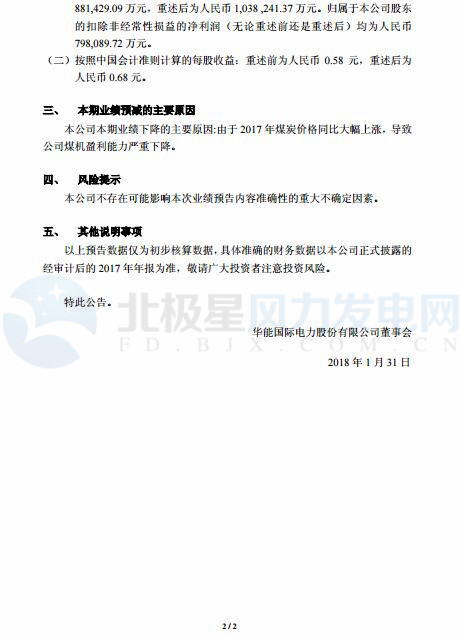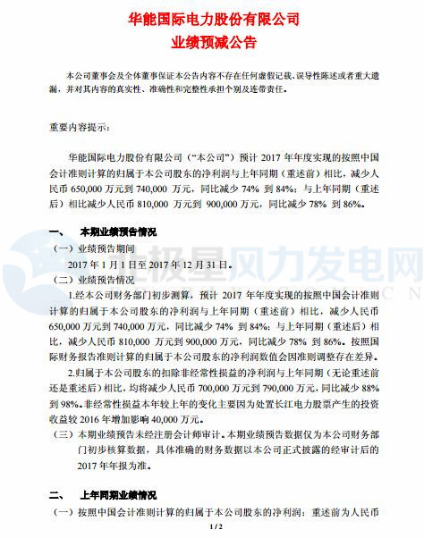 華能國(guó)際預(yù)計(jì)2017 年歸屬于股東的凈利潤(rùn)與上年同期(重述前)相比,減少650,000 萬(wàn)元到 740,000 萬(wàn)元,同比減少 74% 到 84%;與上年同期(重述后)相比減少人民幣 810,000 萬(wàn)元到 900,000 萬(wàn)元,同比減少 78% 到 86%。