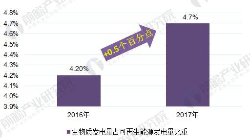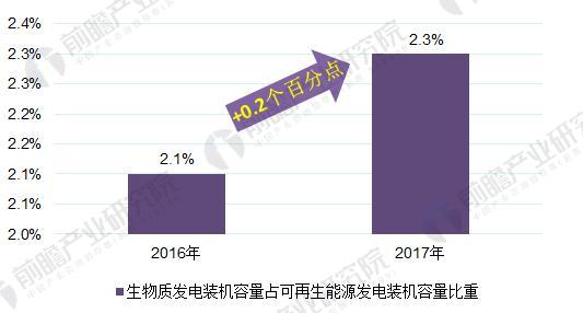 圖表4:2016-2017年生物質(zhì)能源發(fā)電裝機(jī)容量占可再生能源發(fā)電裝機(jī)容量比重變化情況(單位:%)