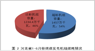 河北省共調(diào)研78臺(tái)機(jī)組,裝機(jī)容量2691.4萬(wàn)千瓦,其中低于310克/千瓦時(shí)裝機(jī)容量1234.4萬(wàn)千瓦,占總?cè)萘康?6%,高于310克/千瓦時(shí)裝機(jī)容量1457萬(wàn)千瓦,占總?cè)萘康?4%(圖2)。1-6月份機(jī)組平均煤耗約為316.53克/千瓦時(shí)。