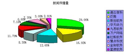 從網(wǎng)絡(luò)新聞傳播(以百度新聞搜索為參考)的角度來看,通達(dá)信科的傳播量最高,占前十強總量的29.06%,其次是泛微,新聞傳播量達(dá)16.92%,致遠(yuǎn)軟件以12.65%的占比次之。