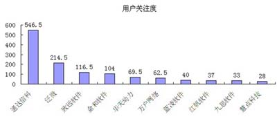在用戶關(guān)注度方面,通達(dá)信科以546.5的指數(shù)遙遙領(lǐng)先,遠(yuǎn)高于第二名泛微的214.5,致遠(yuǎn)軟件的用戶關(guān)注度為116.5,排在第三。而金和軟件、華天動力、萬戶網(wǎng)絡(luò)、藍(lán)凌軟件、紅帆軟件、九思軟件、慧點科技則分別位居第4-10位。