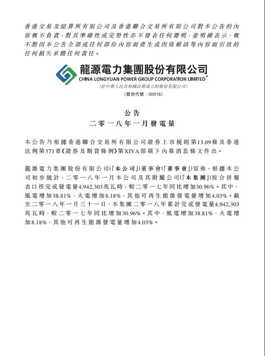 龍源電力(00916)發(fā)布公告,2018年1月,該集團按合并報表口徑完成發(fā)電量494.2萬兆瓦時,較2017年同比增加30.96%。其中,風電增加38.81%,火電增加8.18%,其他可再生能源發(fā)電量增加4.03%。