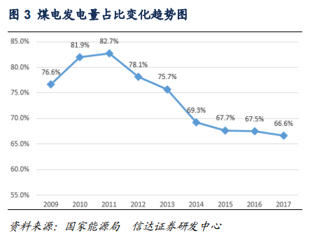 作為以煤為主的資源型國(guó)家,我國(guó)的發(fā)電能源也是以電煤為主。近年來,發(fā)電裝機(jī)容量中60%是煤電,發(fā)電量中約70%是煤電。一方面,按照目前的技術(shù)成熟度和成本優(yōu)勢(shì)來看,煤電是我國(guó)最穩(wěn)定的配套電源,我國(guó)煤電規(guī)模巨大,年均發(fā)電量在40000億千瓦時(shí)左右,據(jù)最新統(tǒng)計(jì)數(shù)據(jù)顯示,2017年,煤電發(fā)電量約為42000億千瓦時(shí),在發(fā)電量中約占66.7%,雖然比2016年發(fā)電量占比67.5%略有回落,但煤電亦向高效清潔利用轉(zhuǎn)型,其他任何能源在今后相當(dāng)長(zhǎng)時(shí)間內(nèi)還不可能完全取代煤電在電源結(jié)構(gòu)中的核心地位;另一方面,近年來煤電發(fā)電量占比一直在降低,進(jìn)入“十三五”以來,煤電發(fā)電量占比降速逐漸放緩,也就是說,為保障我國(guó)未來用電剛性需求,未來煤電將更多地承擔(dān)支撐電力系統(tǒng)運(yùn)行、給系統(tǒng)調(diào)峰等作用,但煤電仍是我國(guó)的主力電源,在電力系統(tǒng)中的主體地位不會(huì)發(fā)生變化。