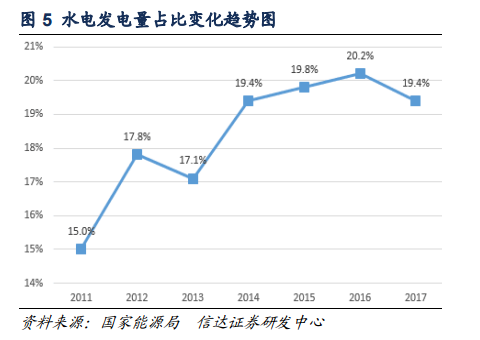 從發(fā)電量角度而言,2017年水電發(fā)電量約為12211億千萬時(shí),水電發(fā)電量增速由2016年的3.8%降至2.2%,水電發(fā)電量在全國(guó)全社會(huì)用電量中的占比也由2016年的20.2%降至2017年的19.4,這主要是因?yàn)樽罱鼉赡隁夂蛟驅(qū)е碌乃坎粔虺渥?,未來我們預(yù)計(jì)水電發(fā)電量在全社會(huì)用電量中的占比將維持在20%左右;近年來,風(fēng)電裝機(jī)容量在發(fā)電設(shè)備裝機(jī)總量中的占比不斷提高,2017年,風(fēng)電發(fā)電量約為3057億千瓦時(shí),約占全社會(huì)用電量的4.8%,并網(wǎng)風(fēng)電裝機(jī)容量占比達(dá)到9.2%,整體上呈現(xiàn)逐漸上升的趨勢(shì)。