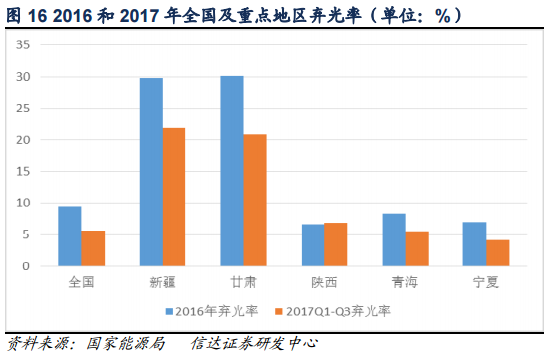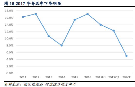 2017年,我國(guó)重點(diǎn)省份及主要河流(河段)利用良好,除了金沙江中游和大渡河地區(qū)水能利用率不到70%,其他地區(qū)和河流水能利用率都在85%以上;2017年,棄風(fēng)問題有所緩解,全國(guó)風(fēng)電發(fā)電量3057億千瓦時(shí),設(shè)備平均利用小時(shí)1948小時(shí)、同比提高203小時(shí)。棄風(fēng)電量419億千瓦時(shí),同比減少78億千瓦時(shí)。2017年,全國(guó)光伏發(fā)電量1568.2億千瓦時(shí),全國(guó)棄光電量73億千瓦時(shí)。全國(guó)棄光率5.6%,同比下降了3.8個(gè)百分點(diǎn)。可以看出,2017年的棄風(fēng)、棄光情況較2016年下降了不少,但離國(guó)家規(guī)劃的2020年棄風(fēng)率5%以內(nèi)、棄光率3%以內(nèi)的目標(biāo)還有一定距離。隨著棄水棄風(fēng)棄光問題的解決,煤電發(fā)電份額將下降。