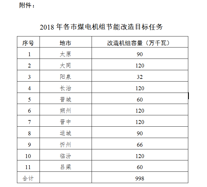 山西省印發(fā)《2018年各市煤電機(jī)組節(jié)能改造目標(biāo)任務(wù)》