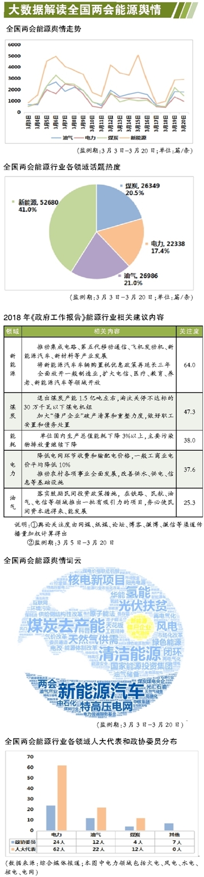 全國(guó)兩會(huì)是代表委員共商國(guó)是的政治盛會(huì),也是觀察產(chǎn)業(yè)動(dòng)向、把握行業(yè)脈搏的窗口,更是回應(yīng)社會(huì)輿論關(guān)切的重要平臺(tái)。2018年兩會(huì)新增“委員通道”“代表通道”等,給予了更多代表委員與媒體交流的機(jī)會(huì),能源“大咖”們的曝光率有所增加,能源好聲音的聲量也有所提升。