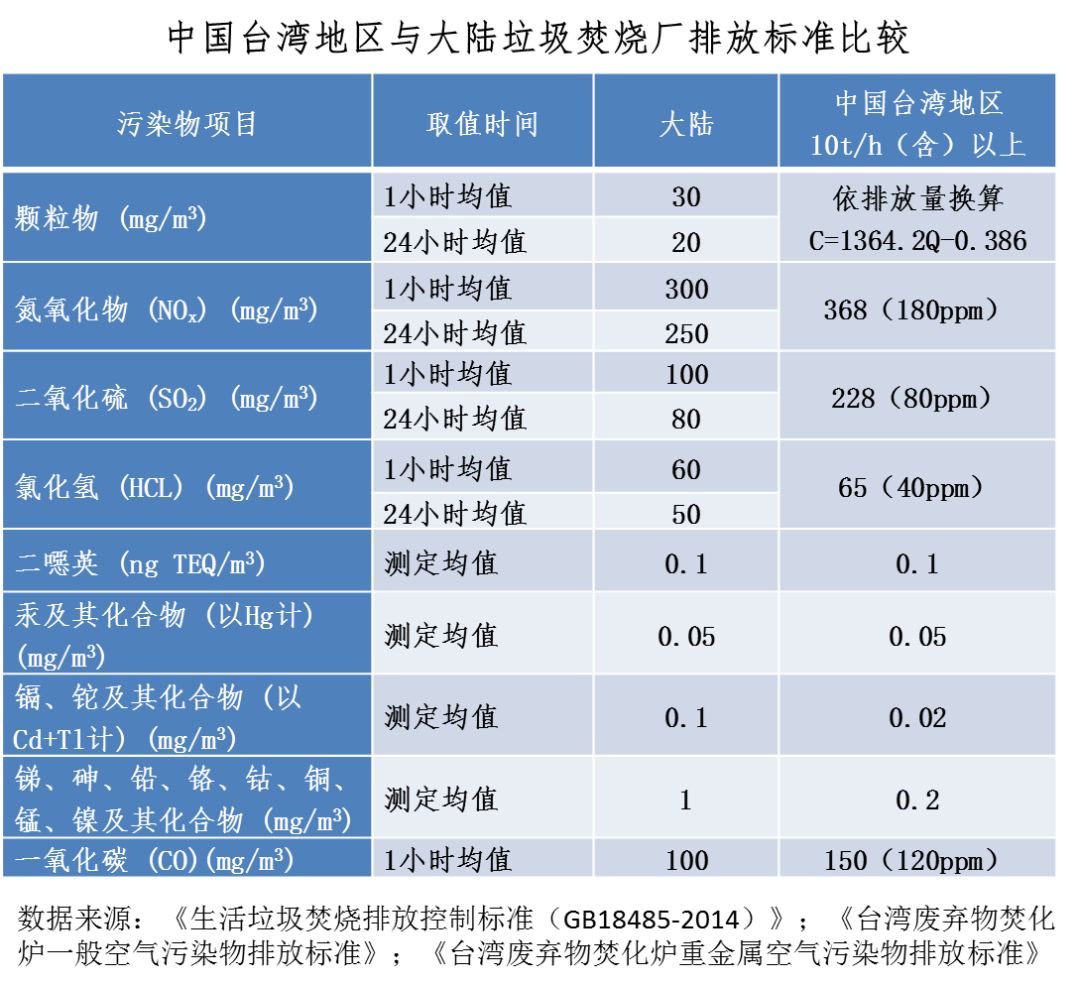 生態(tài)環(huán)境部于2014年5月16日發(fā)布《生活垃圾焚燒排放控制標(biāo)準(zhǔn)》(GB18485-2014)。對(duì)比大陸和臺(tái)灣的生活垃圾焚燒爐排放污染物限值(取10t/h以上焚燒爐標(biāo)準(zhǔn))可見,一是針對(duì)氮氧化物、二氧化硫、氯化氫、一氧化碳等大氣污染物,大陸已制定了相較臺(tái)灣更為嚴(yán)格的標(biāo)準(zhǔn);二是針對(duì)重金屬類特征污染物,臺(tái)灣的控制要求更加嚴(yán)格。