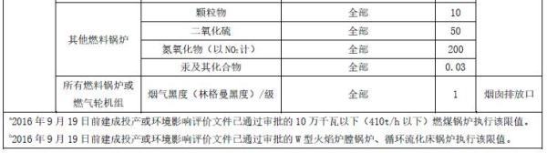 2016年9月19日前建成投產(chǎn)或環(huán)境影響評價文件已通過審批的燃煤鍋爐,2016年12月31日前建成投產(chǎn)或環(huán)境影響評價文件已通過審批的燃油、燃氣鍋爐或燃氣輪機組及其他燃料鍋爐,自本標準實施之日起至2019年12月31日止,不分控制區(qū)執(zhí)行表1中的排放濃度限值。