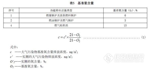 實測的火電廠顆粒物、二氧化硫、氮氧化物和汞及其化合物排放濃度,必須按公式(1)折算為基準氧含量排放濃度。各類鍋爐或燃氣輪機組的基準氧含量按表5的規(guī)定執(zhí)行。