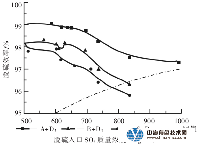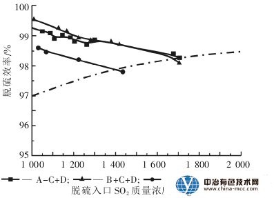 整體脫硫效率A+D>B+D>C+D,在SO2濃度小于700mg/m3時(shí),3種運(yùn)行方式的脫硫效率均能滿足排放要求。