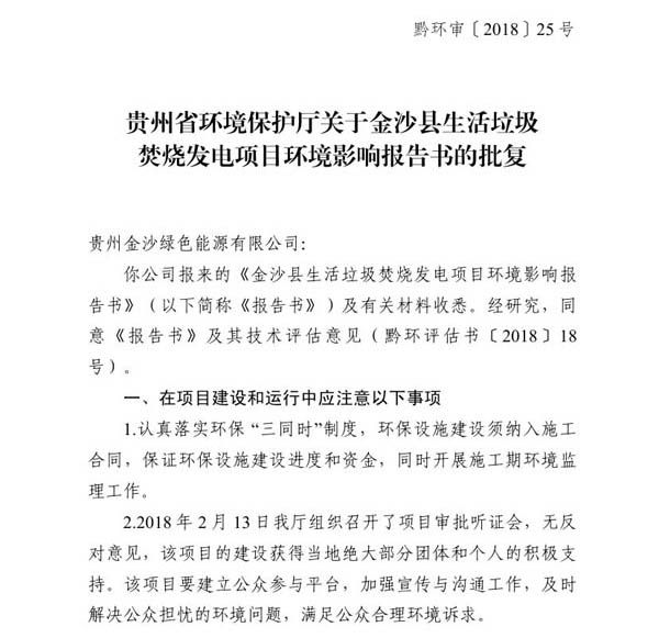 近日,貴州省環(huán)保廳批復了2個電力項目環(huán)境影響報告書,分別為金沙縣生活垃圾焚燒發(fā)電項目環(huán)境影響報告書和威寧縣生活垃圾焚燒發(fā)電項目環(huán)境