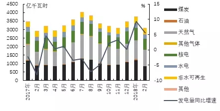 2018年2月,美國(guó)凈發(fā)電量為3065億千瓦時(shí),同比增長(zhǎng)5.6%,增速較上月回落3.7個(gè)百分點(diǎn)。常規(guī)能源發(fā)電中煤炭發(fā)電量同比有所減少,天然氣發(fā)電量同比增長(zhǎng)明顯。其中煤炭發(fā)電量為821億千瓦時(shí),同比減少6.0%;天然氣發(fā)電量963億千瓦時(shí),同比增長(zhǎng)22.6%。