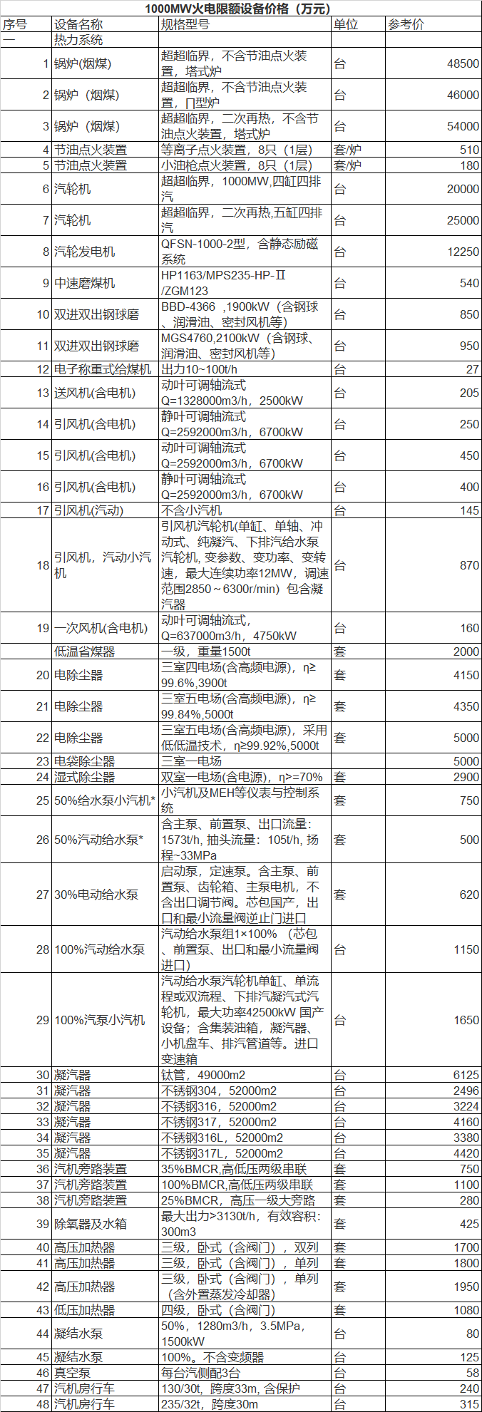 史上最全1000MW火電機(jī)組關(guān)鍵設(shè)備參考價(jià)格匯總