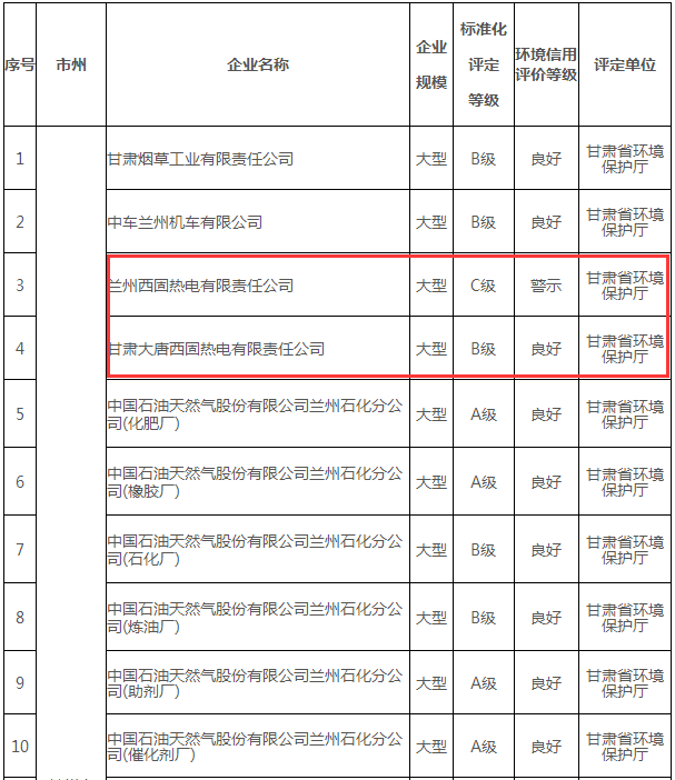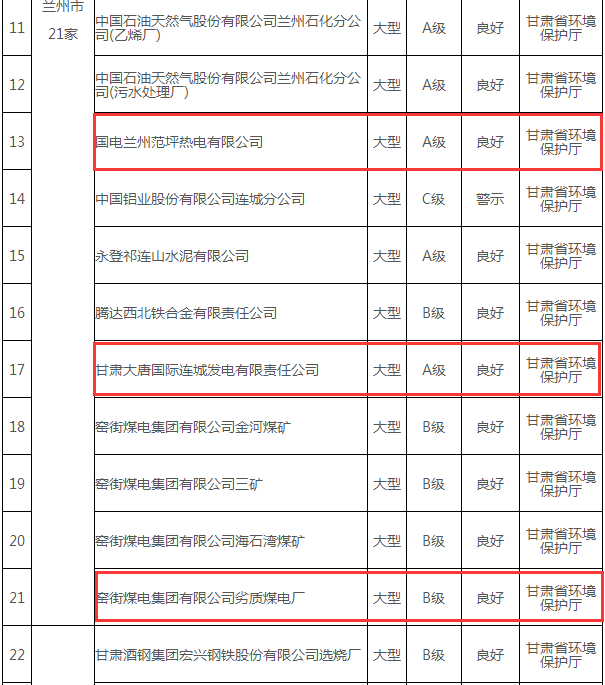 甘肅省2017年工業(yè)企業(yè)環(huán)境保護標準化建設暨環(huán)境信用評價等級評定結果:涉及8個火電企業(yè)