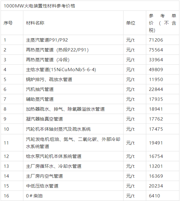你想知道的1000MW火電機(jī)組裝置性材料參考價格全在這里