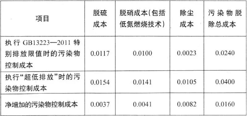 表1、執(zhí)行GB13223-2011特別排放限制和“超低排放”時(shí)各污染物控制成本比較(元/kWh)