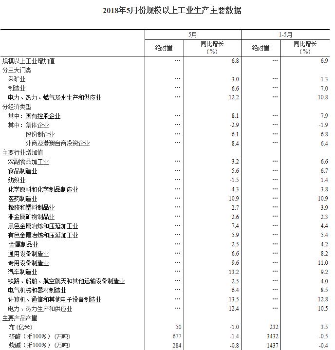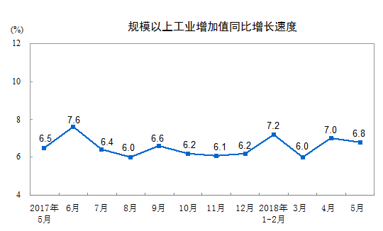 2018年5月份,規(guī)模以上工業(yè)增加值同比實際增長6.8%(以下增加值增速均為扣除價格因素的實際增長率),比上年同月加快0.3個百分點,比4月份回落0.2個百分點。從環(huán)比看,5月份,規(guī)模以上工業(yè)增加值比上月增長0.58%。1-5月份,規(guī)模以上工業(yè)增加值同比增長6.9%,與1-4月份持平。